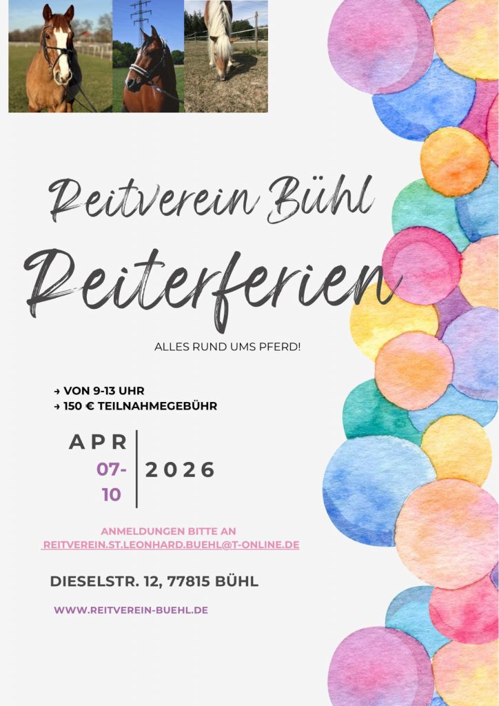 Unser Verein besteht seit 1968 und hat derzeit über 250 Mitglieder. Zu finden sind wir im Bühler Industriegebiet unweit der A5. Unseren Reitern steht eine 20 x 40m Reithalle sowie ein Außenreitplatz mit herrlichem Blick auf den Schwarzwald zur Verfügung. Neben den sportlichen Aktivitäten rund um den Pferdesport legen wir besonderen Wert auf das freundschaftliche Miteinander unserer aktiven und passiven Mitglieder. Gerne begrüßen wir unsere Gäste in unserem gemütlichen Reiterstübchen. Wir wünschen Ihnen viel Spass beim Stöbern auf unserer Website und freuen uns über Ihre Anfrage oder Ihr Feedback!